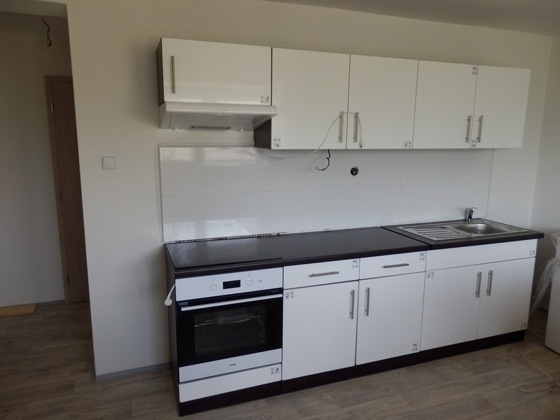 s kuchyňským koutem, který je vybaven moderními vestavenými spotřebiči